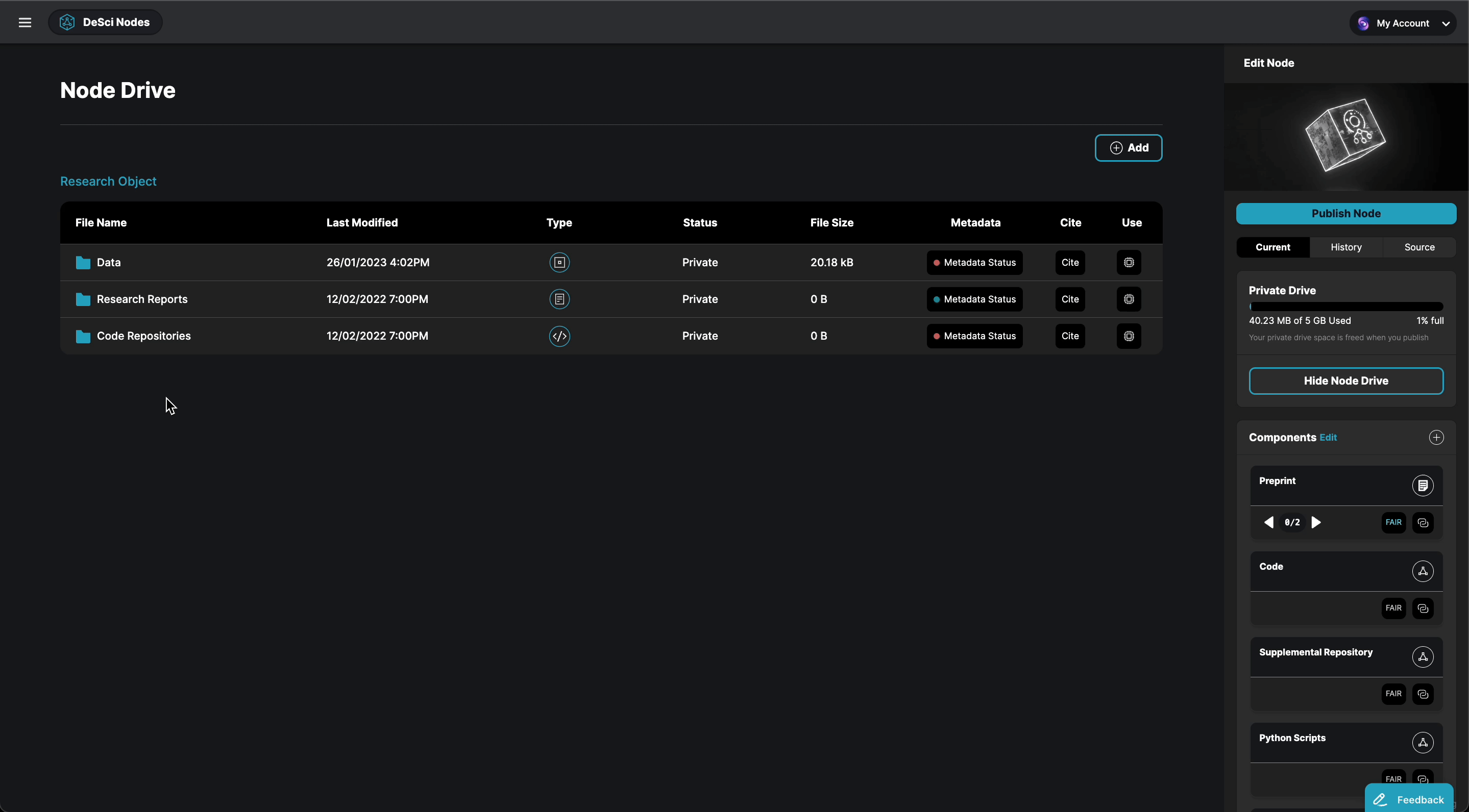 Nodes are optimized for re-usability and interoperability. Each component published with DeSci Nodes has its unique [content identifier (CID)](https://docs.desci.com/technical-background/persistent-identifiers-101#solving-content-drift). This identifier is, as the name says, based on the component's content -- and therefore unique to this component (and its exact duplicates). You can use CIDs to access your components through other applications connected to the IPFS network, like compute over data with [Bacalhau](https://www.bacalhau.org/).